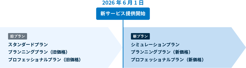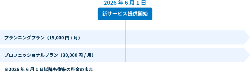 ※2026年5月31日までに「プランニングプラン」または「プロフェッショナルプラン」をご契約された場合、2026年6月1日以降も、本改定に伴う変更はなく、現在のご契約内容およびご利用料金のままサービスをご利用いただけます。